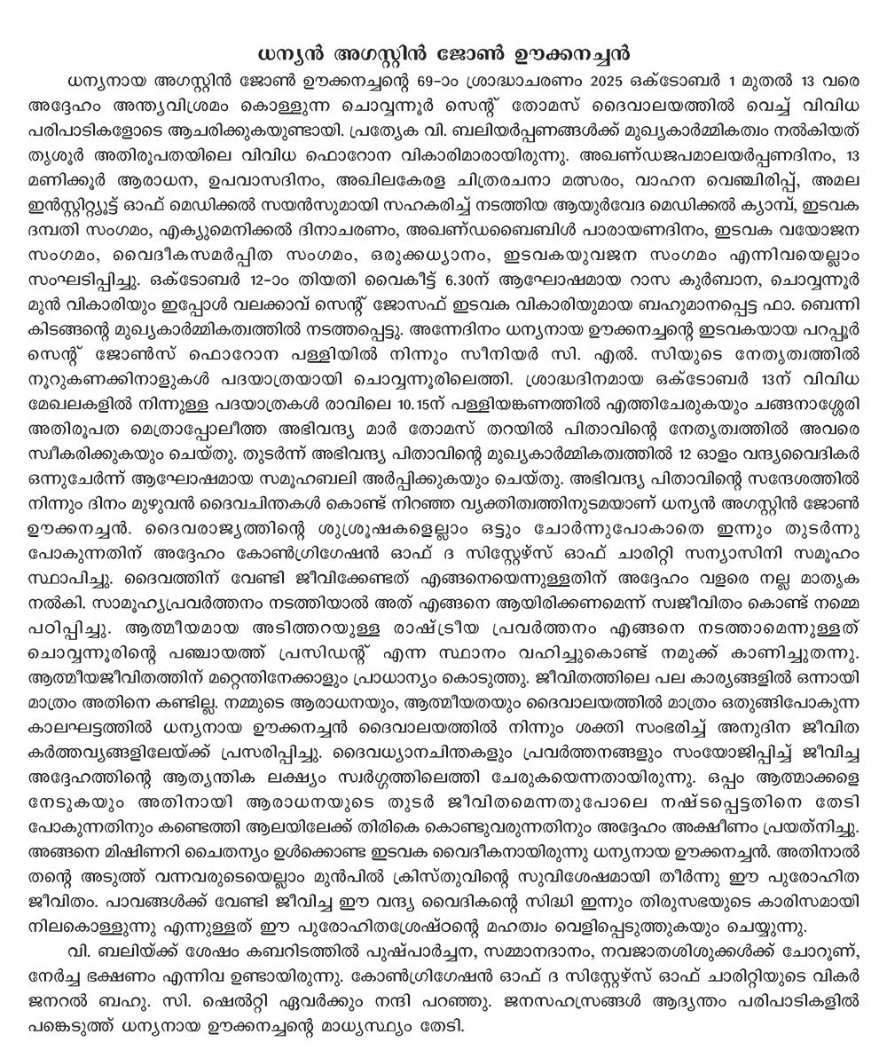 The Venerable Fr. Augustine John Ukken (1880-1956), was a Diocesan Priest of Thrissur, hailing from the parish of Parappur